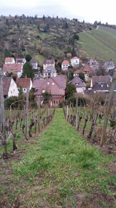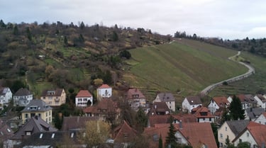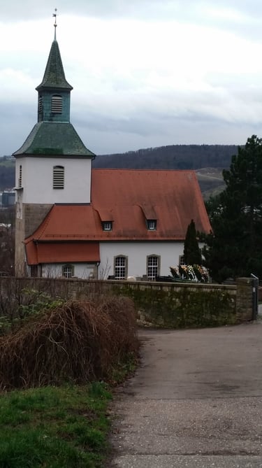 ortskirche mit kirchhof am hang nahe weinberge am neckar, nebenfluss des rheins