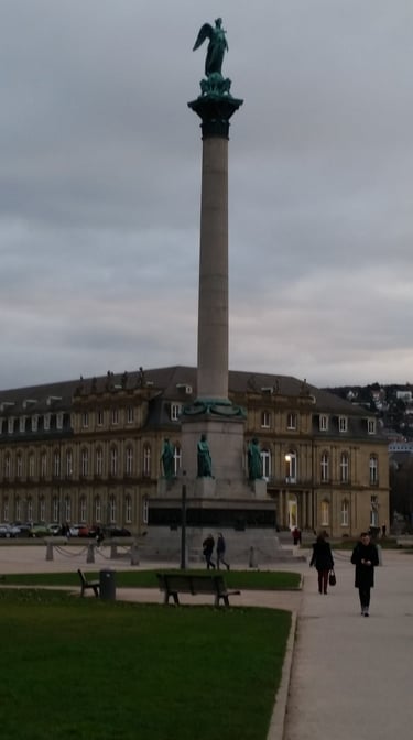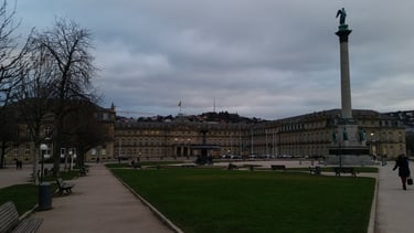 die Jubiläumssäule Rechts ragt in den bewölkten Himmel, dahinter erstreckt sich das Neue Schloss. Der Platz wirkt ruhig, nur wenige Fußgänger gehen über die Wege, was der Szene eine stille, beinahe schwermütige stimmung verleiht.