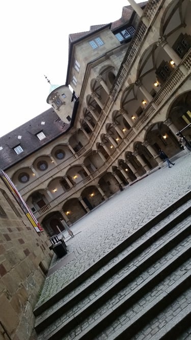 Der Innenhof des ehemaligen wasserschloss im Alten Schloss Stuttgart ist von Arkadengängen mit regelmäßigen Säulen umgeben. Darüber liegt eine umlaufende Galerie bzw. ein Balkon, der die Gebäudeflügel verbindet. Die offenen Bögen und die klare Gliederung schaffen einen hellen, ruhigen Raum .