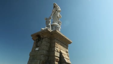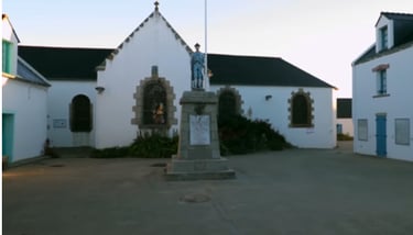 Bald erscheint die Pointe du Raz, einer der Höhepunkte der Reise. Von den Klippen des Cap Sizun eröffnet sich ein atemberaubender Blick auf die Iroise-See – hier erreichen wir den äußersten Westen. Die Statue der „Notre-Dame des Naufragés“ (Unserer Lieben Frau der Schiffbrüchigen) ehrt die auf See verschollenen Seeleute. Im Hintergrund erhebt sich die Île de Sein, die letzte Bastion vor dem Atlantik.